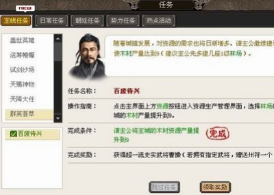 主线任务新增“群英荟萃”任务,玩家通过群英荟萃主线任务,在初期就能获得史实武将,魏国玩家能获得史实武将曹操,蜀国玩家能获得史实武将刘备,吴国玩家能获得史实武将孙权;之后通过任务不断的进展还将获得更多的史实武将,最终任务根据创建君主时选择的国家不同,最后可获得关羽、典韦、周瑜其中的一个。