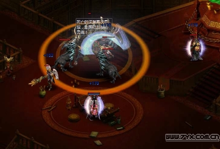 其次是光圈技能。他是光圈内的玩家会受到2500点固定伤害,期间必须跑出去。当然的诅咒光圈亮起来的时候,近身的战士需要往不同的方向后撤,对BOSS的伤害交给远程的道士和法师,待光圈消失之后,战士再回去砍。
