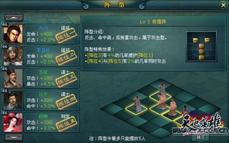 阵型六:奇煌阵。该阵的加成属性让人垂涎三尺,尤其是还有连携属性,在前排队友出击时可能发动合击,使对手一招毙命!此阵为目前使用最频繁的大众阵法。