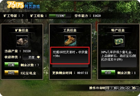 同时在福地开采资源,也是很讲究学问的。福地系统不同时刻给每位挖矿的玩家都有不同的奖励,如“挖掘紫晶时,收获量+50%”“翻牌几率+30%”等。要想获得效益最大化,最高限度的挖掘资源,玩家就必须时刻留意福地系统中的奖励。