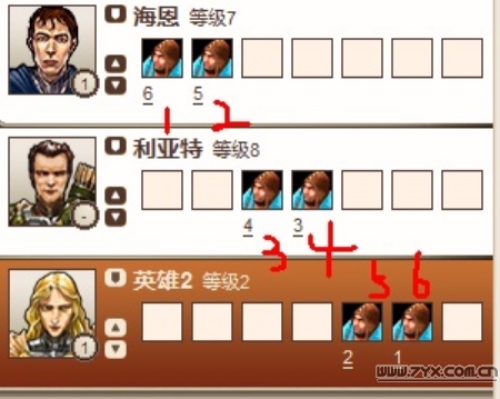 如图,三个英雄分别带不同数量的兵,而魔法释放回合如图中所标,可以达到连放4个乃至更多的魔法的效果。因为王国的规律,防守的时候,哪个英雄带兵就由哪个英雄放魔法,如果魔法设置在34回合,同时该英雄的兵在34回合出战,那他就会释放魔法。